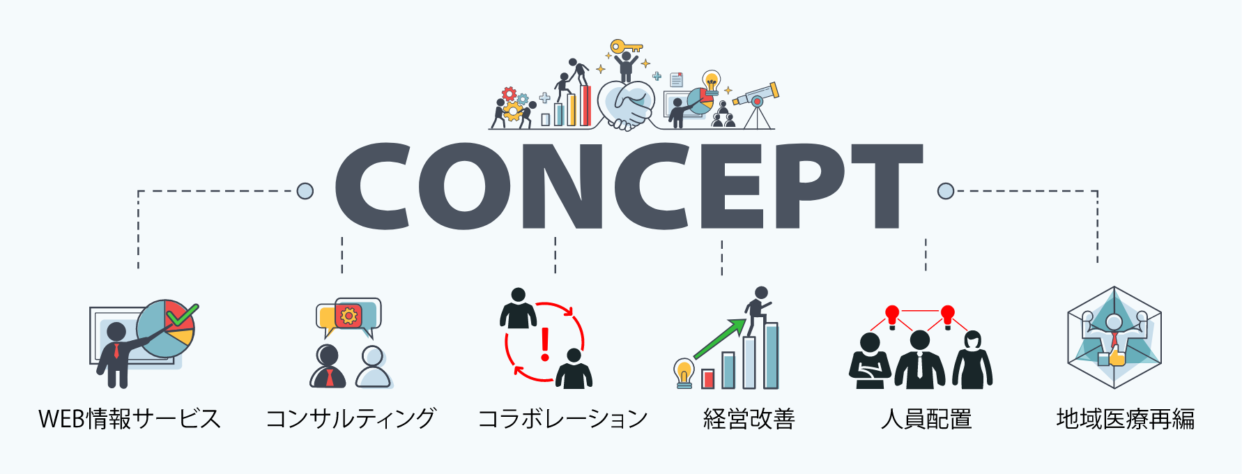 日本ヘルスケアプランニング株式会社では、地域医療再編・経営改善・人員配置を柱に、医療機関経営支援を行っております。 地域医療再編では、地域に合った医療機能再編のお手伝いを、経営改善ではDPCデータ、医事課データなど、データをもとに経営状態を分析し、業務フローの改善など具体的な収益改善策を提示し、スムーズな導入・実行をサポートしていきます。